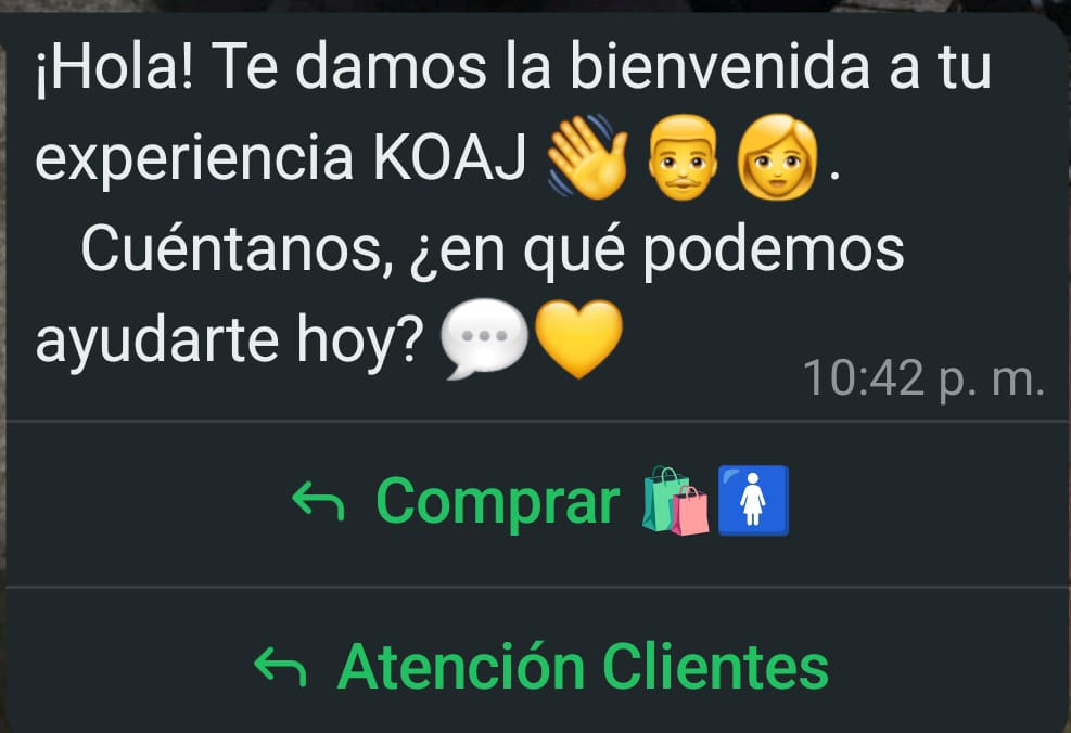 Una vez ingreses a nuestro WhatsApp oficial y después de aceptar nuestra política de tratamiento de datos personales tendrás dos caminos: Comprar y Servicio al Cliente.