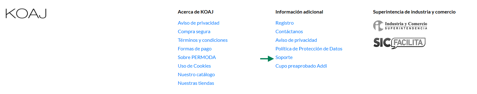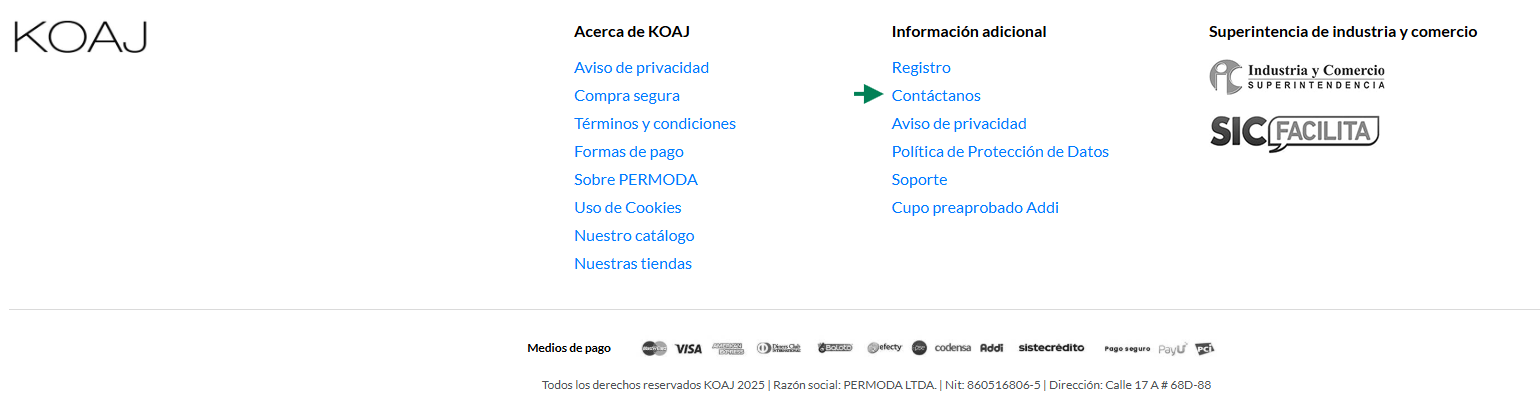 Tienda Virtual: koajonline@koaj.coTambién nos encuentras en redes sociales:Por cualquiera de nuestros canales de atención estamos en capacidad de radicar tus peticiones, quejas y reclamos. No olvides que en nuestra página de soporte también encuentras soluciones a tus preguntas